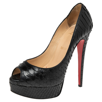 Stand out from the crowd with this gorgeous pair of Louboutins that exude high fashion with class Crafted from python, this is a creation from their Lady Peep collection. They feature a classic black shade with peep toes and a textured exterior. Completed with leather insoles, stiletto heels, and signature red soles, these pumps are a dream you can add to your collection