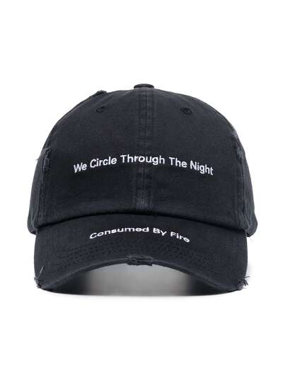 This black MISBHV We Circle embroidered cap is crafted from cotton. It features a domed crown, eyelet vents, curved peak and an adjustable strap to the back. It is finished with embroidery which reads, 'We circle through the night consumed by fire.' Well, call us Johnny Cash, because this MISBHV cap is exactly our kind of ring of fire.