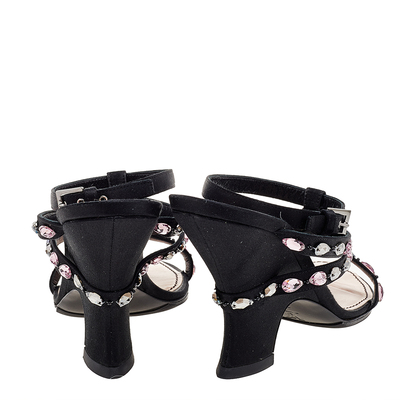 Charm your way to all your social gatherings in this pair of slide sandals from Louis Vuitton. Crafted from black satin, they carry a smart design with open toes, embellishments on the straps, and sturdy heels. Comfortable insoles make them a pair worth owning