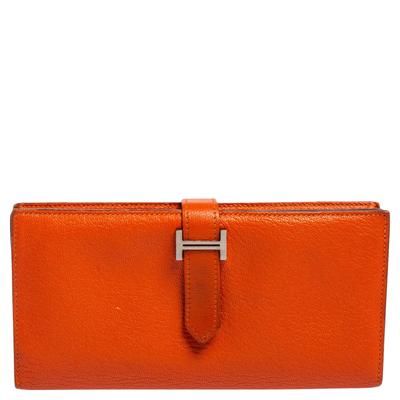 Luxuriously crafted by the House of Hermés, this stunning Bearn Gusset wallet is a must have accessory for luxury fashion lovers. This wallet carries an elegant appeal and a sleek silhouette. It is made using Feu Mysore leather on the exterior and comes with silver toned hardware and a leather lined interior. It is great for everyday use.