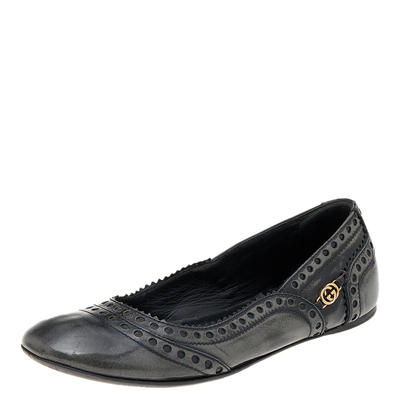 Experience both comfort and style as you wear these chic and stylish ballet flats from the House of Gucci. They are created using black grey Brogue leather on the exterior and are embellished with a gold toned logo accent. Comfortable and classy, they are great for everyday use.