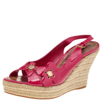 These pretty sandals from Louis Vuitton will surely make you the center of attention every time you step out in them They are crafted from patent leather and are styled in an open toe silhouette with buckled slingbacks, and comfortable insoles. The sandals are complete with espadrille platforms and wedges.