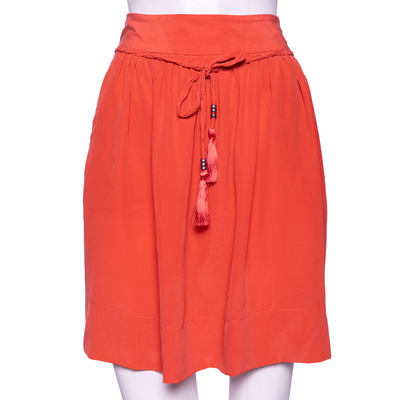 Whether its your beach vacay or a casual summer outing, this skirt from See by Chloe is a beautiful outfit choice that will make you look trendy It is tailored using coral pink silk fabric and comes with a braided tassel belt. It has a zip closure and two external pockets.
