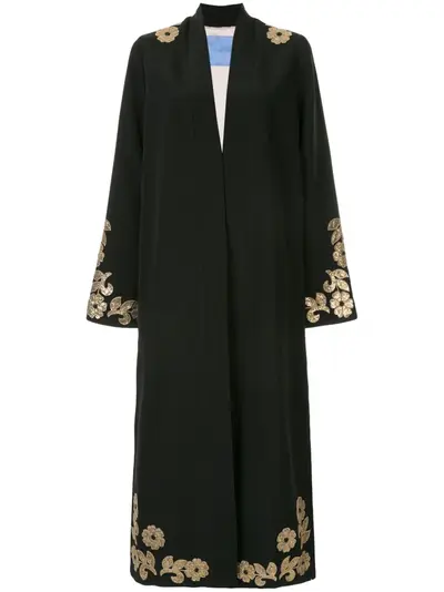 Black silk Whiskey robe coat from MacGraw featuring a long length, long wide sleeves and embellishment at the neck, cuffs and hem.