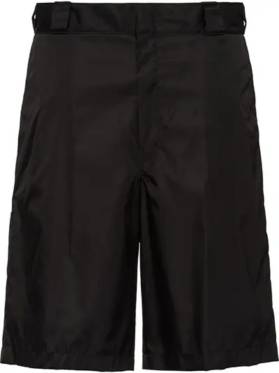 Miuccia Prada’s AW18 show brought an infusion of technical designs with bold and futuristic geometric patterns and the recurring Prada Velcro tab fastenings such as these black nylon gabardine Bermuda shorts. Crafted from technical nylon fabric, they feature a hook and zip fastening, belt loops, side pockets, two back buttoned welt pockets, a back slip pocket and rear logo plaque.