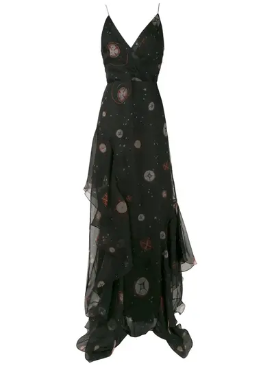 Black silk Amabile dress from Isolda featuring spaghetti straps, a ruffled design, a v-neck and an all-over print.