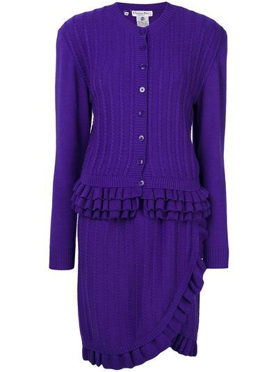 circa 1990s purple wool Cardigan cable knit ribbed detailing ruffle hem round neck front button fastening long sleeves Skirt cable knit ribbed detailing ruffle hem wrap design knee-length Condition: EXCELLENT. This previously owned item is in near-perfect condition with no signs of damage or use.