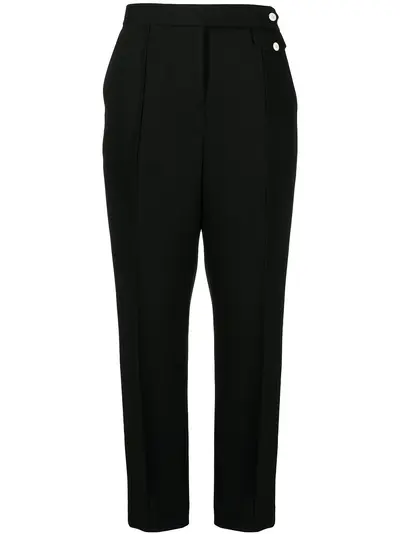 black pressed crease high waist concealed front fastening slim cut two side slit pockets two rear welt pockets