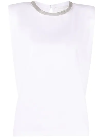 white cotton jersey knit chain-link detailing crew neck keyhole detail to the rear shoulder pads sleeveless straight hem