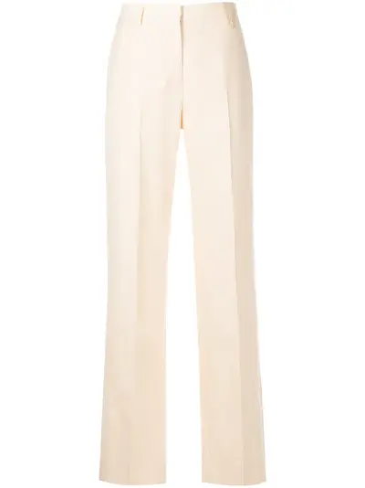 buttermilk virgin wool signature TB monogram plaque high waist belt loops concealed front fastening two side slit pockets two rear welt pockets straight leg