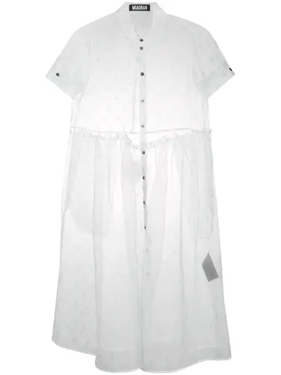 White polka-dot chiffon shirt dress from MIAORAN featuring a polka dot print, a Peter Pan collar, a front button fastening, short sleeves, a ruffle trimming, a flared skirt and a midi hemline.