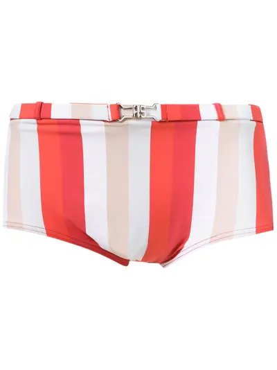 Red, white and beige striped swim briefs from Amir Slama featuring a mid rise, an elasticated waistband, a metallic buckle, a striped pattern, a logo plaque and a lining.