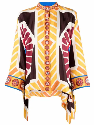 multicolour silk motif print collarless front button fastening handkerchief hem
