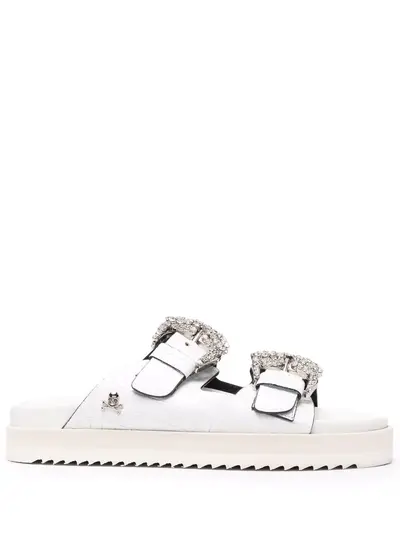 white leather crystal buckle detail double buckle fastening open toe moulded footbed flat rubber sole