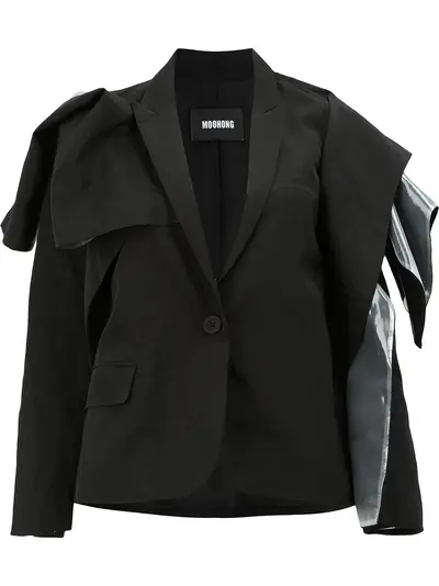 Black vinyl insert ruffled blazer from Moohong featuring narrow lapels, long sleeves and a button fastening.