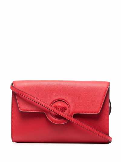 red leather grained texture Medusa-head motif debossed logo adjustable detachable shoulder strap foldover top with magnetic fastening main compartment internal zip-fastening pocket internal card slots