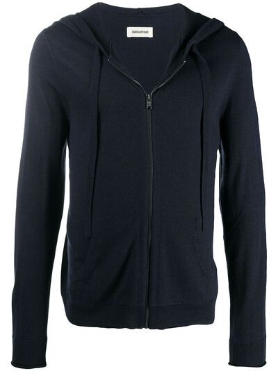 Navy blue merino Clash hooded jacket from Zadig & Voltaire featuring a drawstring hood, a front zip fastening, long sleeves, a kangaroo pocket and a ribbed hem.