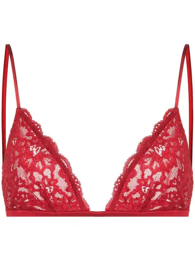 red silk-blend triangle cup lace detailing rear clasp fastening adjustable shoulder straps Just a reminder that this piece must be tried on over your own garments.