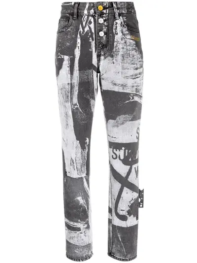 grey cotton all-over graphic print high waist front button fastening belt loops classic five pockets slogan print to the side logo patch to the side tapered leg