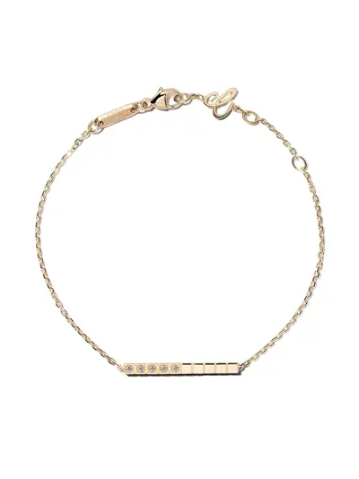 Chopard’s ‘Ice Cube’ collection comprises of meticulously-crafted, faceted squares reflecting the geometry of glistening ice cubes, channelling cool elegance with a contemporary edge. Designed from 18kt yellow gold, this ethical-certified ‘fairmined’ Ice Cube Pure bracelet features a fixed bar semi-set with exquisite white diamonds and a delicate, adjustable chain with an easy lobster clasp closure. Inspired by the vision of ice, the cubic geometrical shapes allow for an exquisite frosty sharpness. The total diamond content is 0.10ct. This Chopard product is made of 100% Ethical Gold, acquired from responsible sources and verified against international best practices on environmental and social standards.