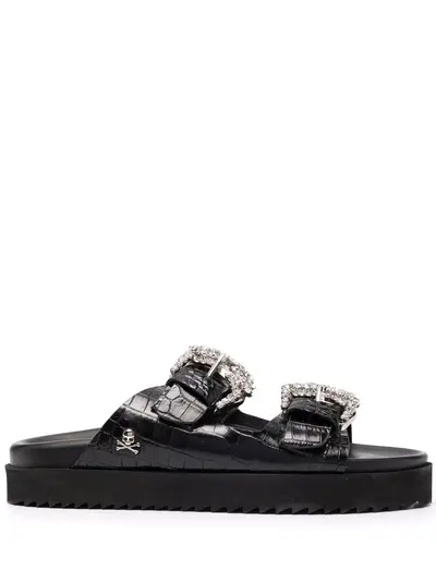black leather crystal buckle detail double buckle fastening open toe moulded footbed flat rubber sole