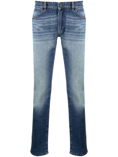 medium blue stretch-cotton mid wash whiskering effect low-rise straight leg front button and zip fastening classic five pockets