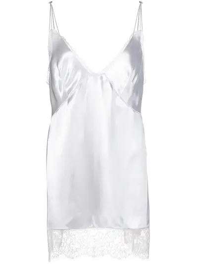 White Emi lace-hem top from Khaite featuring lace inserts, a scalloped lace hem, a plunging neck and spaghetti straps.