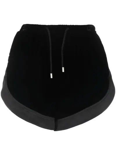 Black silk drawstring-fastening mini shorts from SAINT LAURENT featuring drawstring fastening waist, contrasting trim and curved hem.