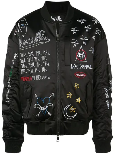 Black Nocturnal bomber jacket from Haculla featuring a ribbed collar, a front zip fastening, a chest pocket, side pockets, embroidered details, a zipped pocket at the sleeve, a relaxed fit and a ribbed hem and cuffs.
