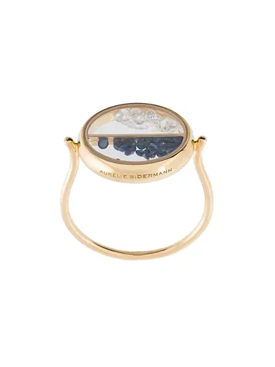 This pretty Chivor diamond and sapphire ring from fine jewellery designer, Aurelie Bidermann boasts an engraved logo sapphire glass medallion containing small loose blue sapphires (0.8ct) and small loose white diamonds (0.5ct). Expertly crafted in her Parisian atelier, this striking Chivor ring is a personal favourite. A signature Aurelie Bidermann piece to be treasure, this elegant ring sports a refined thin 18kt yellow gold band. The ring measures 13mm in diameter.