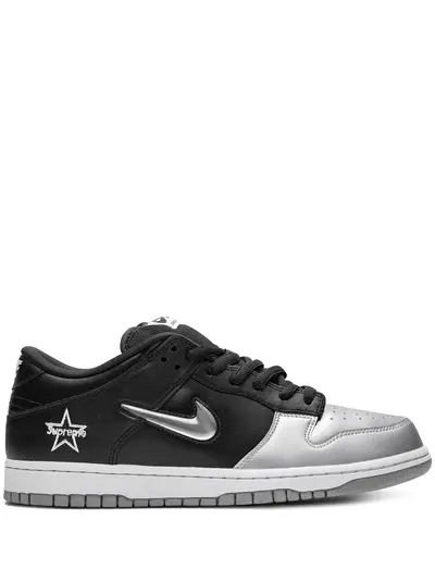 Supplied by a premier sneaker marketplace dealing with unworn, already sold out, in demand rarities. Each product is rigorously inspected by experienced experts guaranteeing authenticity.. The Supreme x Nike SB Dunk Low “Jewel Swoosh Silver” is one of three colorways released in the fall 2019 collaboration from Supreme and Nike SB. The theme of the collection takes cues from mid ‘90s-era Nike Air Force 1 Mids that featured two-tone color blocks and jeweled metallic Swoosh detailing. Composing the upper of the SB Dunk Low is a black leather base with a metallic silver perforated toe. A silver jewel Swoosh appears on the mid-panel with a Supreme star logo embroidered on the heel. Nike branding hits are also included on the padded tongue tab and embroidered in silver on the heel. Wrapping up the design is a white midsole and silver outsole. The Supreme x Nike SB Dunk Low “Jewel Swoosh” in black and silver was released on September 5th, 2019.