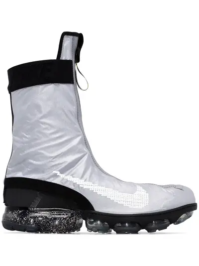 Don't let the rain stop you from your morning jog. Go outside and let your feet pound the pavement in these Nike grey Air Vapormax ISPA Gator sneakers that have a layered design with a front zip fastening up to the ankles that keep your soles dry as you make your way through the miles. Stay fit, no matter what the weather looks like outside. Featuring a round toe, a layered design, a front zip fastening, a lace-up front fastening, a logo tag, an ankle length and a ridged rubber sole.