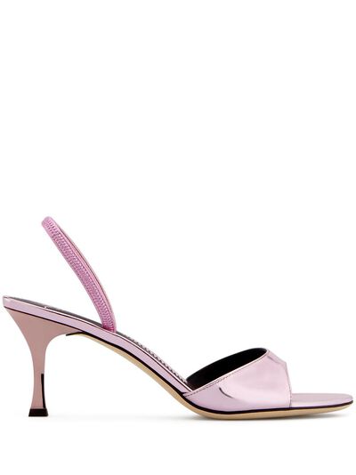 metallic pink leather open toe branded insole tonal stitching metallic finish slingback strap mid sculpted heel