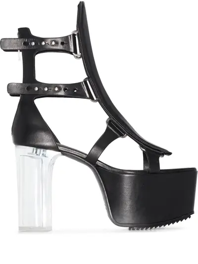 black leather side buckle fastening caged design open toe platform sole high block heel