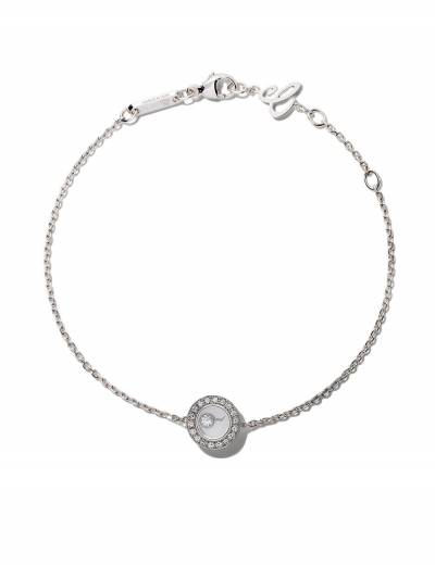 Taking inspiration from the sparkling drops of water in a waterfall, Chopard’s ‘Happy Diamonds’ collection is characterised by moving diamonds that gently dance and twirl to create a joyful cascade of light. Immaculately crafted from 18kt white gold, this stunning Happy Diamonds Icons bracelet features a freely floating diamond which is held between two sapphire crystals on a unique round-shaped charm embellished with pavé set diamonds. It is fixed on a delicate thin chain with an adjustable fit and a lobster clasp closure. The total diamond content is 0.05ct. This Chopard product is made of 100% Ethical Gold, acquired from responsible sources and verified against international best practices on environmental and social standards.