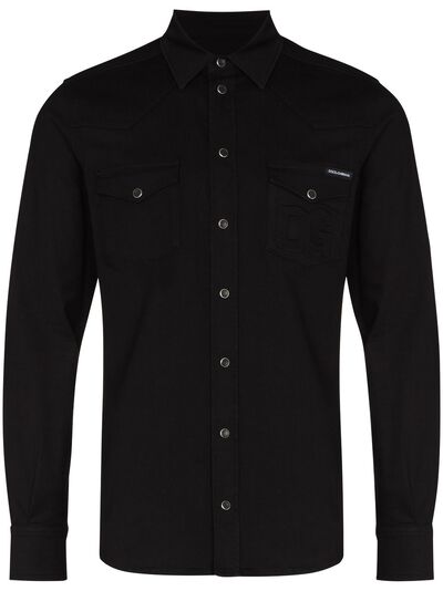 black stretch-cotton embossed logo to the front classic collar front button fastening long sleeves two chest flap pockets buttoned cuffs curved hem