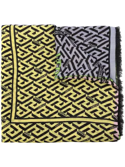 multicolour wool-silk blend rectangle shape colour-block design signature Greca-pattern print logo print to the front frayed edge