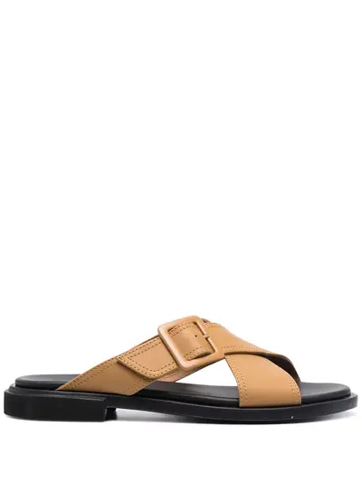 tan brown leather leather lining open toe side buckle fastening branded insole flat rubber sole