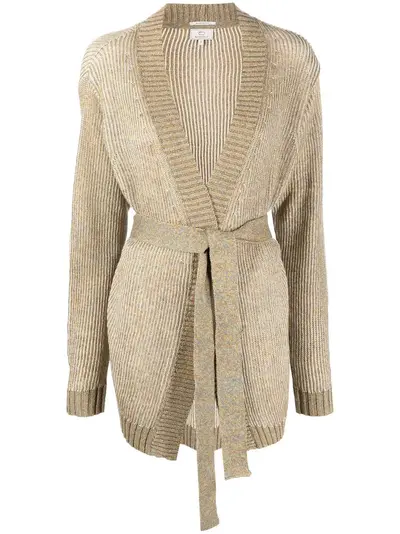 beige cotton-linen blend fine knit V-neck front tie fastening long sleeves