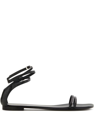 Black leather Catia flat sandals from Giuseppe Zanotti featuring an open toe, an ankle strap with a side buckle fastening, a branded insole and a python skin effect.