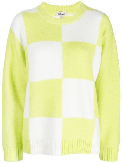 chartreuse green/white wool-blend bold check pattern crew neck long sleeves drop shoulder ribbed cuffs ribbed hem
