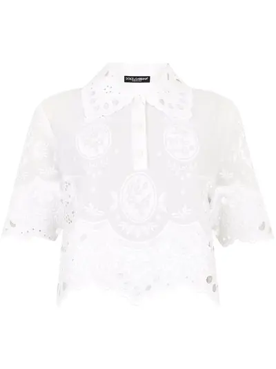 optical white cotton embroidered design classic collar front button placket short sleeves cropped scallop edge