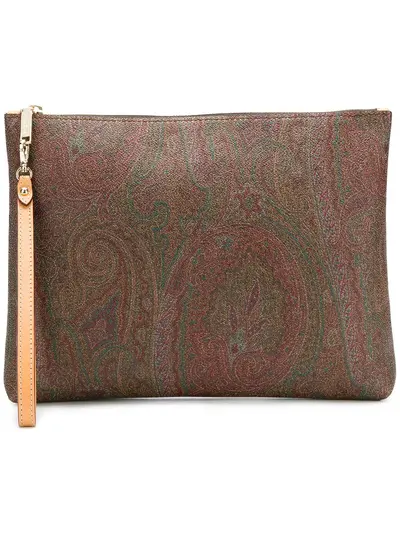 ETRO is synonymous with its bohemian-inspired paisley and floral prints, something which has remained a core element of the collections from the brand’s conception in 1968, right through to the present day. Sleek and practical, this brown paisley clutch bag from ETRO features a top zip closure and a wrist strap.