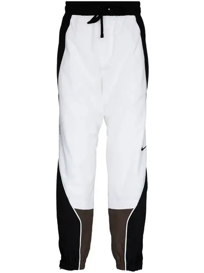 white/black/brown colour-block design signature Swoosh logo detail logo print at the leg elasticated drawstring waistband two side slit pockets rear zip-fastening pocket tapered leg ankle zips elasticated ankles