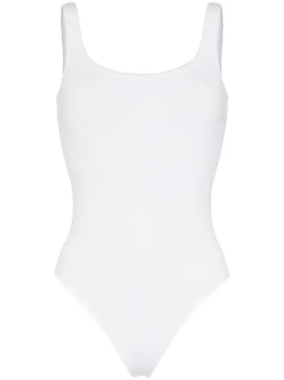 This white Wolford Jamaika string bodysuit suspends from slender shoulder straps, has a second skin fit, and features high-cut legs for a flattering seam free appearance under trousers and skirts. Whoever said, 'You're jamaiking me crazy,' was clearly visualising this Wolford bodysuit. Slip it on, and watch as passers by go wild.