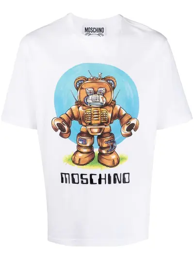 white organic cotton robotic Teddy Bear print embroidered logo to the front crew neck short sleeves