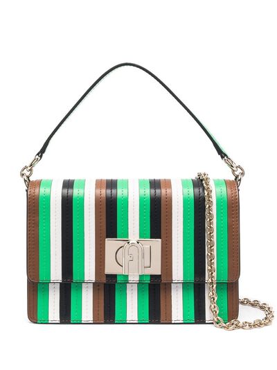 green leather vertical stripe pattern twist-lock fastening single flat top handle chain-link shoulder strap
