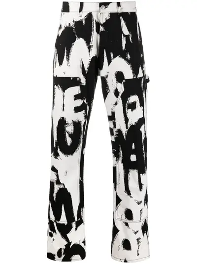 white/black cotton two-tone design signature Graffiti print logo patch to the rear straight leg mid-rise multiple patch pockets concealed fly and button fastening belt loops