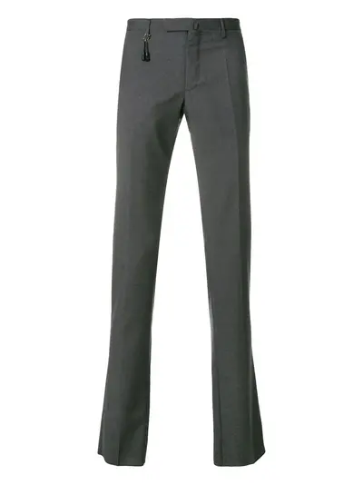 grey front button and zip fastening slip pockets to the sides two rear welt pockets tassel detail belt loops