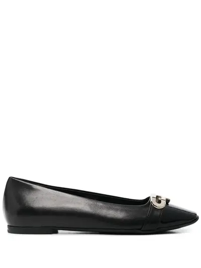 black leather gold-tone logo plaque square toe slip-on style branded insole flat rubber sole